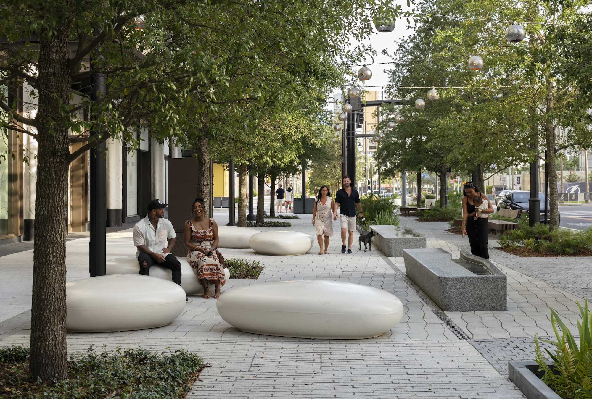 Water Street Tampa’s urban design prioritizes immersive shade and pedestrian-oriented streetscapes. Sidewalks were designed to allow 1,200 cubic feet of soil per tree—supporting the growth of more than 82 live oaks and 512 other trees across the district that will achieve 75% canopy coverage within a decade. The district’s streetscapes and open spaces invite daily use—from quiet reflection under the canopy to local events and performances—reinforcing the project’s civic purpose. Upon completion of the public realm plan, Reed Hilderbrand served as the development’s global landscape architect overseeing the district’s first phase.