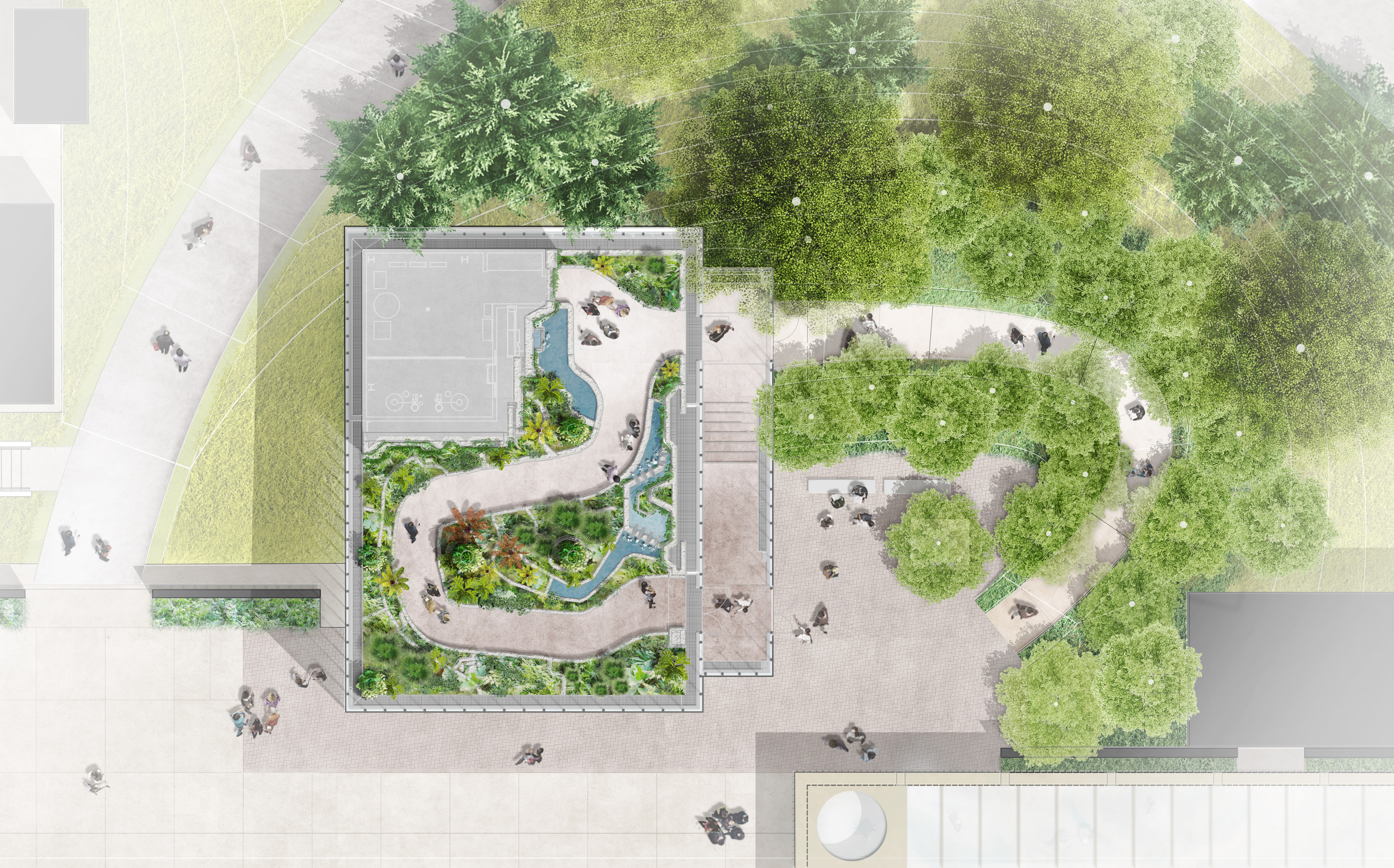 A new 3,800 square foot, WEISS/MANFREDI-designed glasshouse has been created for the garden, which was formerly installed in a retrofitted space in the Main Conservatory. The new, bespoke space recreates exactingly the vertical rock walls, cascading waterfalls, and clear pools designed by Burle Marx. They form the framework for a dense ensemble of plants found in a tropical rainforest, including palms, bromeliads, philodendrons, and more. The new glasshouse also features updated mechanical systems to improve climate control and sustainability. Adjustments to the garden path were meticulously calibrated to meet accessibility standards without compromising the garden’s design, resulting in a more inclusive and now-ADA-compliant experience. A new courtyard entrance includes an arcing path to the garden’s upper entrance through a grove of magnolias.